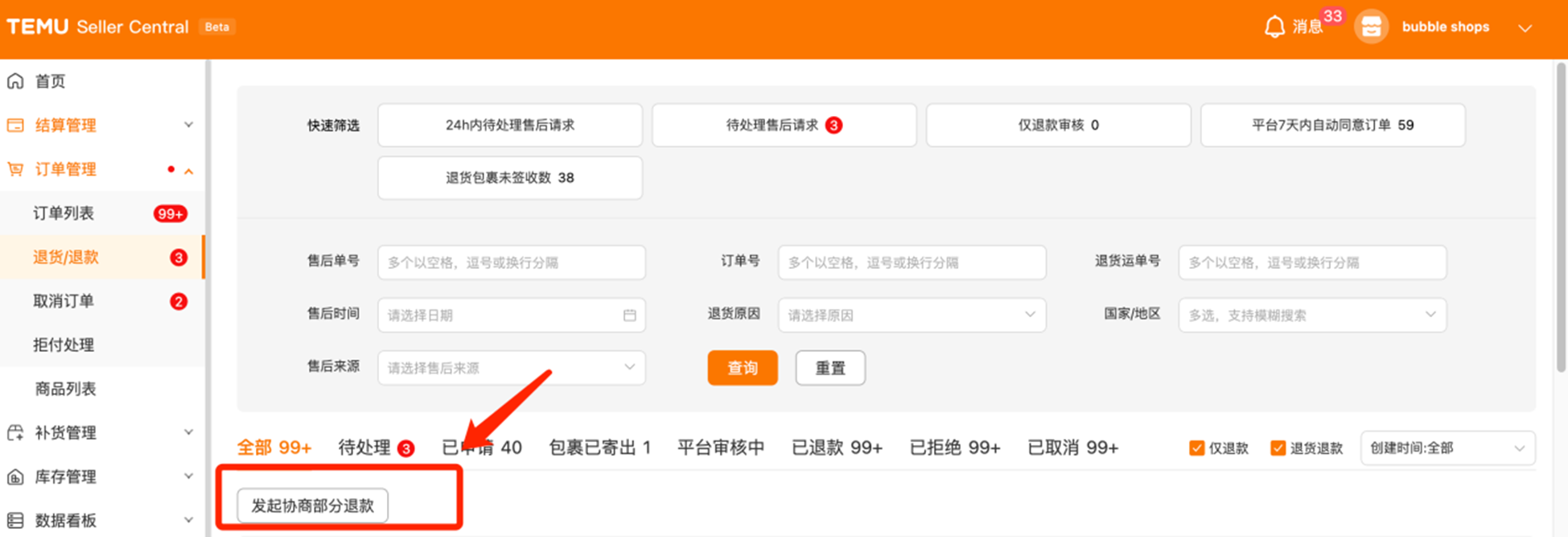 注:如果订单已经存在退货退款的售后单,需要先取消那笔售后单,才能发起协商部分退款。