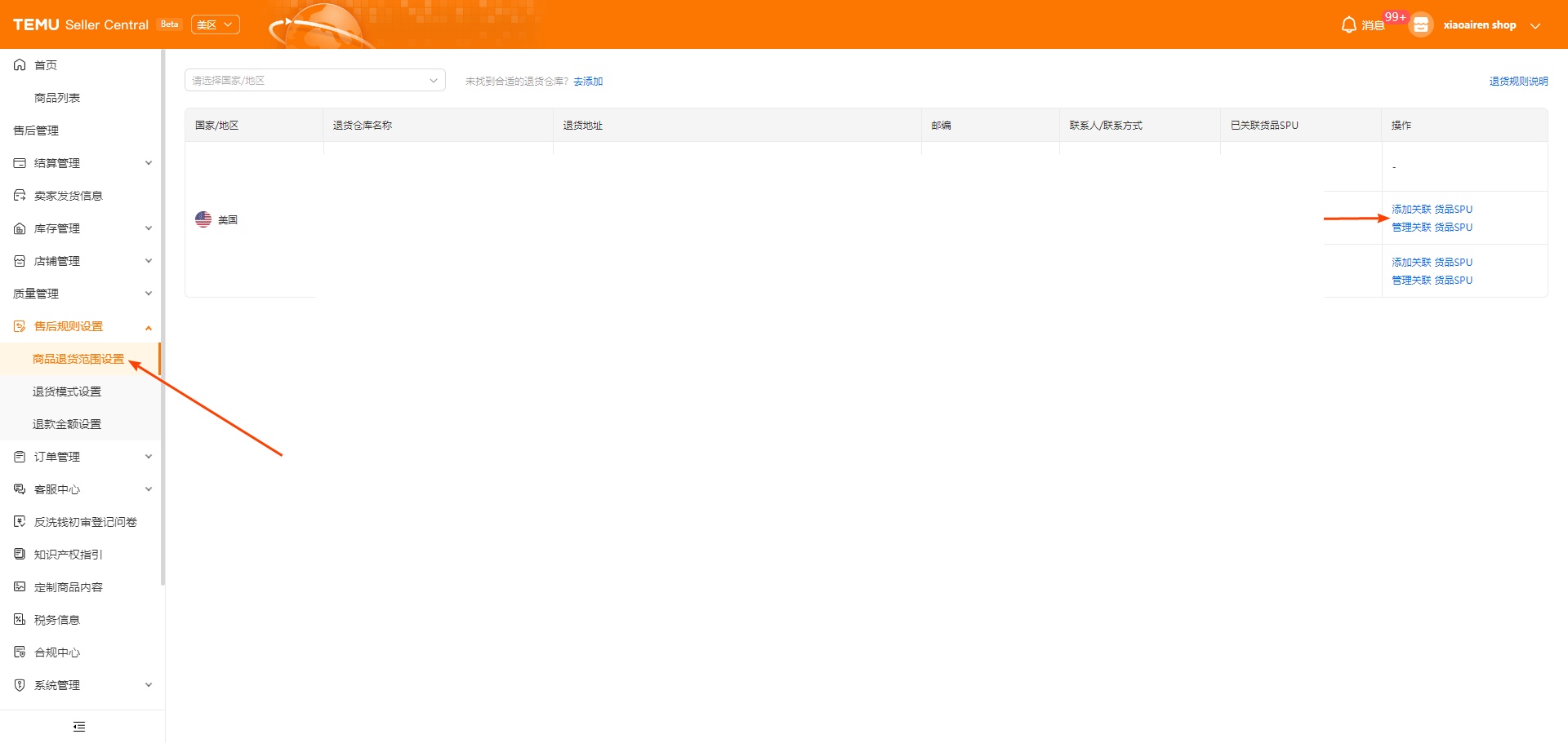 关联商品:美区/欧区卖家中心-售后规则设置-商品退货范围设置