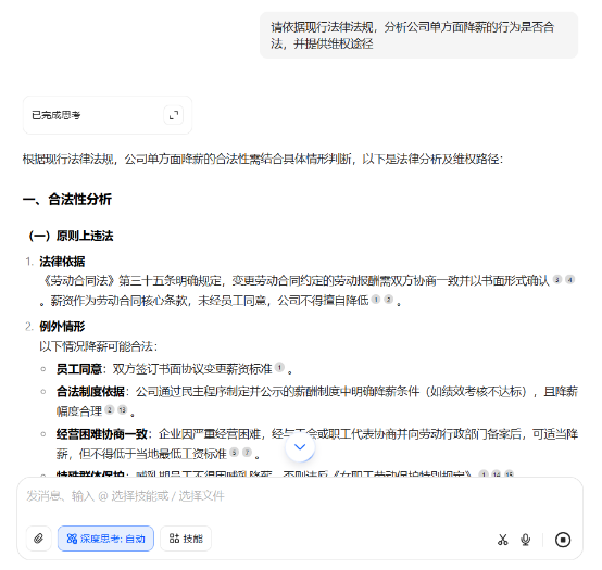 在豆包的输入框中,完整粘贴整理好的问题描述,并添加明确指令,例如 “请依据现行法律法规,分析公司单方面降薪的行为是否合法,并提供维权途径”“帮忙审查这份房屋租赁合同,指出其中存在的法律风险” 。通过清晰的指令,让豆包生成针对性的法律解答内容。